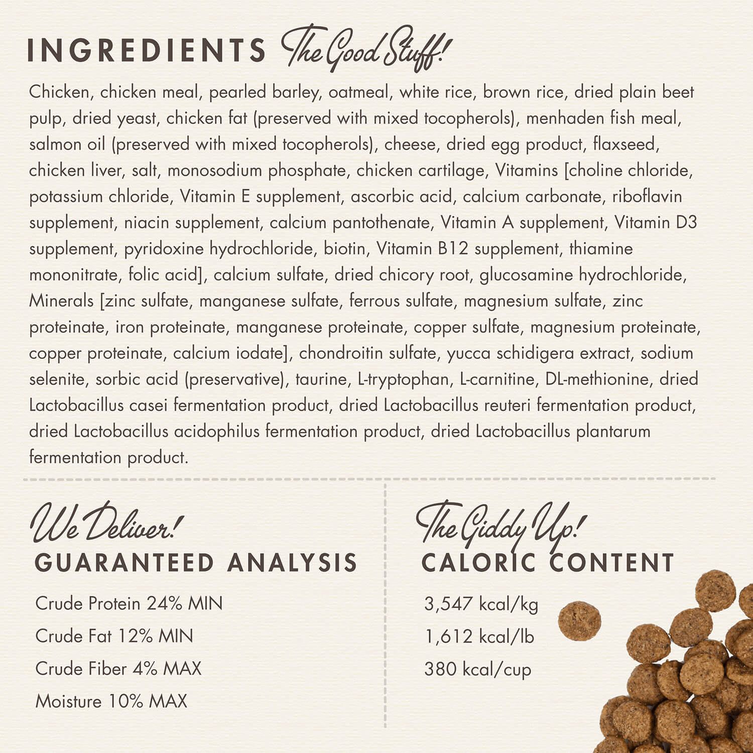 Chicken,Chicken Meal,Pearled Barley,Oatmeal,White Rice,Brown Rice,Dried Plain Beet Pulp,Dried Yeast,Chicken Fat (preserved with mixed tocopherols),Menhaden Fish Meal,Salmon Oil (preserved with mixed tocopherols),Cheese,Dried Egg Product,Flaxseed,Chicken Liver,Salt,Monosodium Phosphate,Chicken Cartilage, Vitamins [Choline Chloride, Potassium Chloride, Vitamin E Supplement, Ascorbic Acid, Calcium Carbonate, Riboflavin Supplement, Niacin Supplement, Calcium Pantothenate, Vitamin A Supplement, Vitamin D3 Supplement, Pyridoxine Hydrochloride, Biotin, Vitamin B12 Supplement, Thiamine Mononitrate, Folic Acid],Calcium Sulfate,Chicory Root Extract,Glucosamine Hydrochloride, Minerals [Zinc Sulfate, Manganese Sulfate, Ferrous Sulfate, Magnesium Sulfate, Zinc Proteinate, Iron Proteinate, Manganese Proteinate, Copper Sulfate, Magnesium Proteinate, Copper Proteinate, Calcium Iodate], Chondroitin Sulfate,Yucca Schidigera Extract,Sodium Selenite,Sorbic Acid (Preservative),Taurine,L-Tryptophan,L-Carnitine,DL-Methionine,Dried Lactobacillus casei Fermentation Product,Dried Lactobacillus reuteri Fermentation Product,Dried Lactobacillus acidophilus Fermentation Product,Dried Lactobacillus plantarum Fermentation Product..