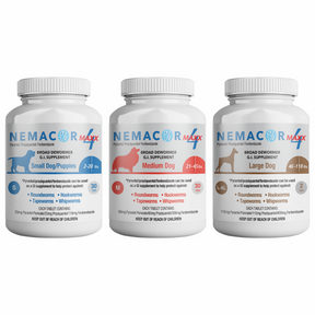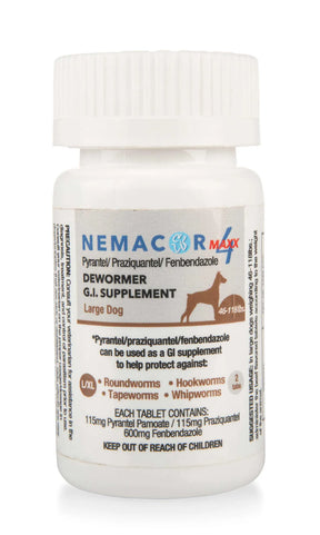 Nemacore Maxx 4 – Quad Wormer is a GI supplement for use against Hookworms, Roundworms, Whipworms and Tapeworms. Suggested dosage is one tablet based on the dogs weight band.