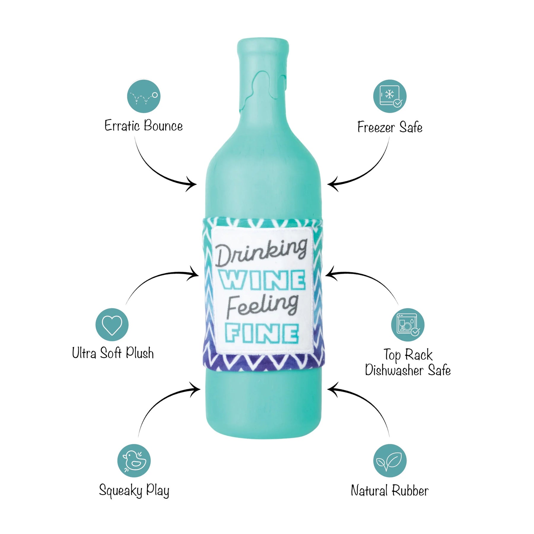 Ready to join the Dura Club? Our "Drinking Wine, Feeling Fine" rubber dog toy is for pups that love to chew and play lots of fetch. Made with a plush wrap label, a natural rubber squeaky toy, and an erratic bounce, this toy was created for long-lasting interactive play. Simply toss it so your pup can enjoy some fetchin' fun while you take some time to wine down!