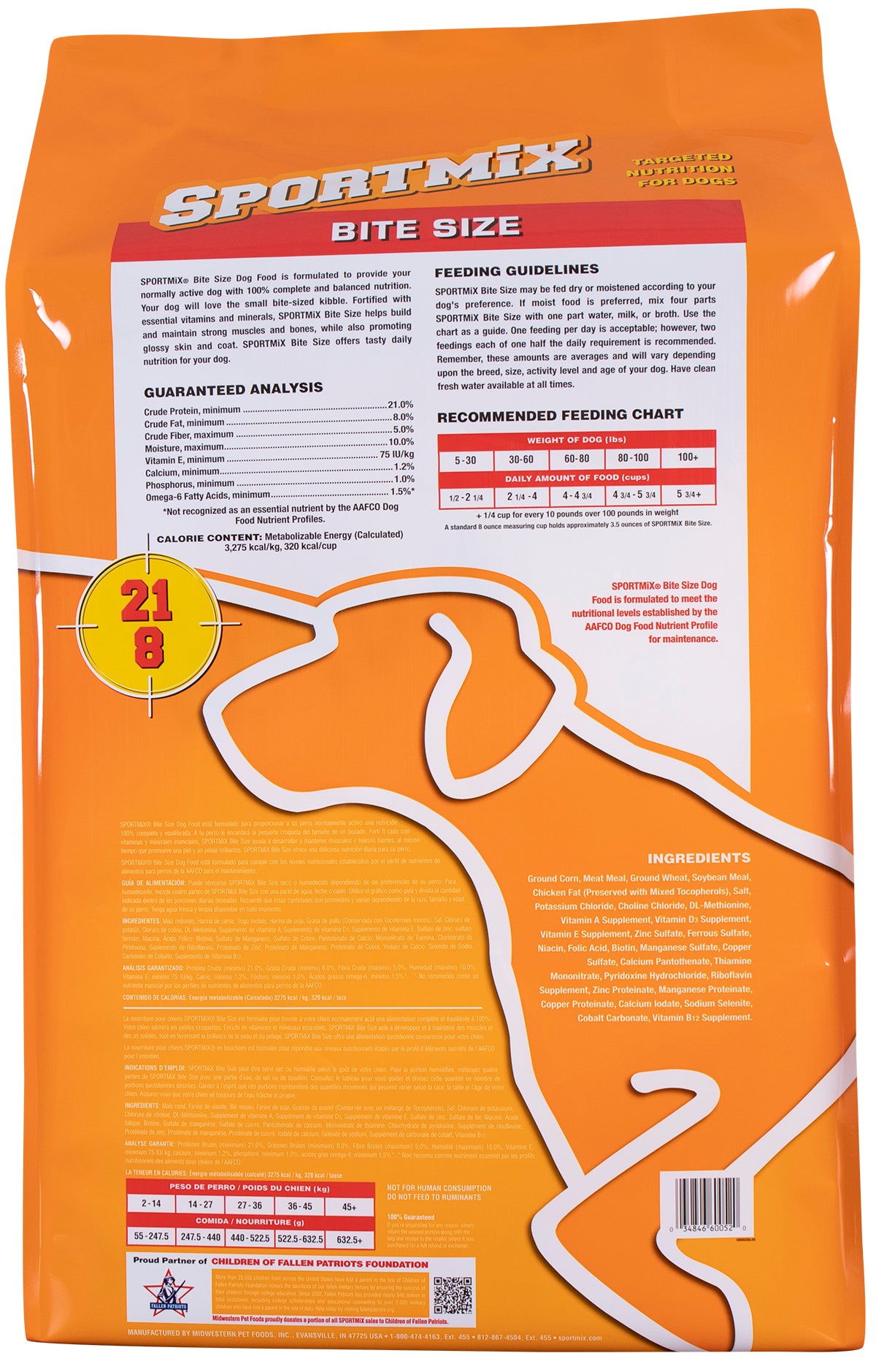 SPORTMiX® Bite Size 21/8 is formulated to provide your normally active dog with 100% complete and balanced nutrition for a healthy life. Made from selected high-quality ingredients and fortified with essential vitamins and minerals, SPORTMiX® Bite Size promotes strong muscles and bones and glossy skin and coat. SPORTMiX® Bite Size is formulated to meet the nutritional levels established by the AAFCO Dog Food Nutrient Profiles for maintenance.